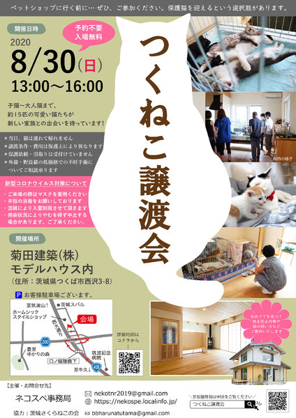 | イベント内容 | つくば市で、モデルハウスをまるごと1棟お借りして保護猫譲渡会を開催します。 ゆとりをもって展示しますので、ゆっくり見学していただけます。 今回から家の窓に脱走防止柵を設置し、猫との暮らしをご提案いたします。 猫の飼い方、準備するもの、病院の選び方などなどお気軽にご相談ください。 参加猫は順次ホームページで紹介予定です。 https://nekospe.localinfo.jp/pages/3110908/page_201908041108 |