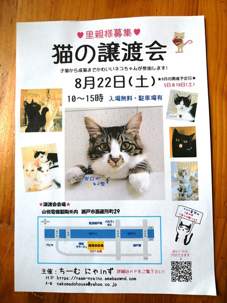 | イベント内容 | 【本文】 2020年8月22日(第4土曜)の10時~15時に瀬戸市内にて、保護猫の譲渡会を開催します!! 当日は、かわいい子猫さんから成猫さんまで、数多くの参加を予定しております♬ ※見学無料・来場予約不要 猫さんをお探しの方、飼ってみたいと思っている方、いろんな『ネコ話』を聞いてみたい方など、是非ご自由にお越しください。 ※新型コロナウイルス感染症拡大防止の為、来場時のマスク着用・入場時の検温・アルコール消毒液での除菌・少人数(2~3組)ごとの入場、送風機による場内換気など、様々な制約が生じてしまいますが、何卒ご協力の方をよろしくお願いいたします。 [主催] ちーむ にゃinず [開催日時] 2020年8月22日(第4土曜日) 10時~15時 [譲渡会場] 瀬戸市西蔵所町29 山悦電機製陶(株) *駐車場有(14台) [ホームページ] ちーむにゃいんず公式HP https://team-nyainz.amebaownd.com/ ちーむにゃいんずFacebookページ https://www.facebook.com/teamnyainz [お問合せ] nekomadohouse@yahoo.co.jp |