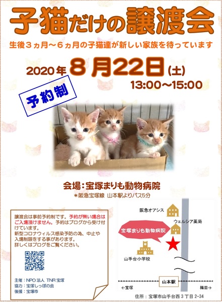 | イベント内容 | 生後3ヶ月~6ヶ月の子猫ばかりの譲渡会です。 かわいい子猫が皆様のお越しをお待ちしています。 10匹~15匹の子猫たちが参加予定です。 ※※ 完全予約制 ※※ 【日時】 2020年8月22日(土) 13:00~15:00 【場所】 宝塚まりも動物病院 ロビー 阪急山本駅バス約5分・兵庫県宝塚市山手台西3-2-34 【ご予約方法】 TNR宝塚のブログからお申し込み下さい。 https://ameblo.jp/takarazuka-tnr/ ※ご注意 申し込み頂けるのは、兵庫県宝塚市から一般道で概ね1時間以内にお住まいの方。 未就学児のがいるご家庭はご遠慮下さい。 その他詳細は、ブログをご覧いただくか、↓までメールでお問い合わせお願いします。 |