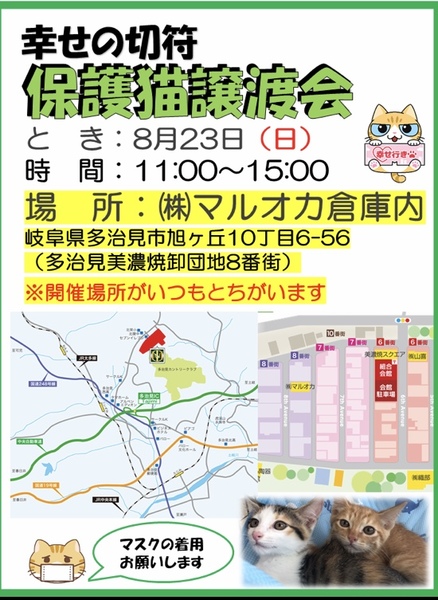 | イベント内容 | 幸せの切符】 猫の譲渡会のお知らせです。 ■とき:8月23日(日) ■場所:株式会社マルオカ倉庫内 〒507-0071 岐阜県多治見市旭ケ丘10丁目6−56 ■時間:11:00~15:00 (準備等で若干遅れる可能性がございます) (遠方保護主が多い為、10:30~11:00頃、猫が揃い始めます) ■参加動物:当日の体調により変動します ★生後3ヶ月~1歳 ※譲渡会に参加していない子もいます。写真を用意していますので、保護主さん宅でお見合いすることも可能です。 ***************************************************** ★詳細は各ホームページをご覧ください。参加猫の日々をつづっています。 【幸せの切符】 http://happyticket.blog133.fc2.com/ 【猫小屋の住人たち】 http://nekogoyaokan.blog.fc2.com/ 【Harelu】 http://120310210831.blog.fc2.com/ ※三仙院へ直接のお問い合わせやご相談はご遠慮願います ★★お問い合わせ先★★ メール: happyticket_gifu@yahoo.co.jp 電話 : 050-1377-3880 ■20時以降のみの対応となります ■留守電になった場合は、番号と用件を残してください。 2~3日以内に折返しご連絡いたします。 ※当日渡しは行っておりません。 ※アンケート記入をしていただき、後日お届けさせていただきます。 ※先着順ではございません |