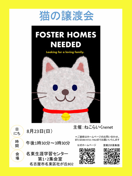 | イベント内容 | 保護猫の里親になりませんか? 《猫の譲渡会のお知らせ》 主催:ねこらいくnenet 日にち:8月23日(日曜日) 時間 :午後1時30分~3時30分 会場 :名東生涯学習センター 第1・2集会室 名古屋市名東区社が丘三丁目802 *専用の駐車場があります。満車の場合は すぐ横、公園駐車場のご利用をおねがいします 〇譲渡会の見学は入場無料・予約不要です 〇保護猫は保護したあと、一定期間、体の状態を観察し、 トイレのしつけや基本的な健康診断を済ませています 〇それぞれの猫の特長や習慣など、現在の保護主より 説明をさせていただきます 〇参加猫はホームページ/募集猫たちで紹介しています https://nekolike.amebaownd.com/ (参加予定猫が体調不良などで急遽不参加になることもあります) ・当日に猫をお渡しすることはありません 後日、ご自宅までお届けに伺います ・1週間から2週間のトライアル期間後、正式譲渡となります ・完全室内飼い・ご家族全員の同意・治療費の一部ご負担などお願い事項があります ・詳しくはホームページ/譲渡についてをご覧ください https://nekonetwork.com/2020/03/31/03/58/35/2671/譲渡について/ *感染症の拡大防止に努めています 〇会場は窓を開放し、常に換気をしています 〇マスクの装着をお願いいたします 〇入り口には消毒薬を用意しています 〇会場内への入室は一定の人数とさせていただきます |