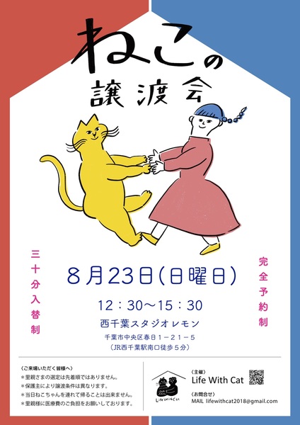 | イベント内容 | 今回も「完全予約制&30分入替制」の譲渡会です。 ブログのお問い合わせフォームよりご予約を受付しております☺︎ https://ameblo.jp/lifewithcat2018/page-2.html ①12:30〜13:00 ②13:00〜13:30 ③13:30〜14:00 ④14:00〜14:30 ⑤14:30〜15:00 ⑥15:00〜15:30 以下を必ずお知らせください。 1.お電話番号 2.ご来場予定人数 3.お見合い希望の猫ちゃんがいればその子の名前 *各時間4〜5組限定です。(参加人数で調整します) 以下の条件を満たしているご家庭のご予約をお待ちしております。 ・子猫の急病に速やかに対応できるお留守番が5時間程度のご家庭 (単独世帯の方に子猫は譲渡しておりません) ・年齢が成人~55歳以下で就労し安定した収入のあるご家庭 ---お願い--- コロナウィルスなどの感染予防のため ご来場の際はマスク着用・入り口でのアルコール消毒・会場内ではお客様同士の感覚の確保にご協力頂き 風邪のような症状のある方や体調の悪い方はご来場を見合わせてください。 また基礎疾患のある方のご来場も控えていただいた方が賢明です。 ----------- *里親さまの選定は先着順ではありません。 *保護主により譲渡条件は異なります。 *当日ねこちゃんを連れて帰ることは出来ません。 後日 保護主が里親様宅へお届けいたします。 *里親様に医療費のご負担をお願いしております。 第36回 Life With Cat『ねこの譲渡会』 8月23日(日曜日) 12:30~15:30 <会場> レンタルスタジオレモン 260-0033 千葉市中央区春日1丁目21-5 (JR西千葉駅/京成西登戸駅より徒歩4分) *駐車場のご用意はございません。 スタジオより徒歩1分圏内にコインパーキングが多数ありますので そちらをご利用ください。 ブログ→https://ameblo.jp/lifewithcat2018/page-2.html |