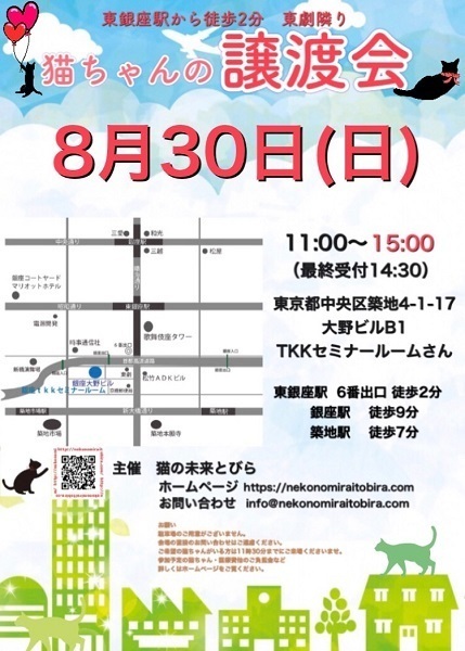 | イベント内容 | 東銀座で保護猫の譲渡会を開催しています「猫の未来とびら」です♪ 恵まれない環境にいる猫たちが未来へのとびらを開いて幸せなご縁に繋がる橋渡しをしていきます。 たくさんの猫ちゃんと保護主・スタッフ一同みなさまのご来場を心よりお待ちしています! 子猫ちゃん〜成猫ちゃんまで参加します♪ ご来場頂く方と私たち保護主、スタッフの安心と安全の為、感染リスクを限りなく低減させる為、私たちが出来うる対策をしてお待ちしております。 【ご来場いただく皆様には下記についてお願い致します】 ★マスクの着用をお願い致します。 (マスク着用のない方は入場出来ません) ★譲渡会場にお入り頂く前に手洗いと手の消毒をお願い致します。 ★ソーシャル・ディスタンス(人と人との間隔を開ける)をお願い致します。 ★熱のある方や体調の優れない方は譲渡会への来場を見合わせて頂けますよう、お願い致します。 ★来場者数によりましては人数制限もありますので長時間お待たせてする場合もございます。 予めご了承下さい。 ★見学だけの方は蜜を避ける為に来場をお断りさせて頂きます。 コロナウイルス感染拡大防止の為、このような厳しいお願いで大変恐縮ですが何卒ご理解とご協力、ご了承をいただけますようお願い致します。 ★☆★★☆★★☆★★☆★★☆★★☆★★☆★★☆★★☆★ ★開催日時 2020年8月30日(日) 11:00~15:00 (最終受付 14:30) ★会場 東京都中央区築地4-1-17 銀座大野ビル B1 TKKセミナールームさんにて (東劇となり) ★最寄駅 東銀座駅 6番出口 徒歩2分 銀座駅 徒歩9分 ・築地駅 徒歩7分 駐車場のご用意はございませんので近隣のコインパーキング等をご利用ください。 会場への直接のお問い合わせはご遠慮くださいませ。 ★☆★★☆★★☆★★☆★★☆★★☆★★☆★★☆★★☆★ 会場で猫ちゃんと触れ合ってご縁を繋いでください。 里親様・猫ちゃんが双方、幸せな家族になれるよう保護主・スタッフがサポート致します。 ご不安な事はお気軽にご相談ください。 入場無料です。事前のご予約は必要ございません。 ご希望の猫ちゃんがいらっしゃる里親希望者様は11時~11時30分までに会場へお越しください。 11時30分までに受付されたすべての里親希望者様と保護主がお話をさせて頂きます。 1匹に複数のお申込み、里親様と猫ちゃんに合うご家庭がございましたら 受付を終了する場合もございます。 里親様が決まっていない猫ちゃんに関しましては随時保護主とご相談ください。 当日猫ちゃんの引き渡しはございません。 後日、保護主が里親様宅へお届けいたします。 ※参加予定猫ちゃんは、急な体調不良等で不参加になる場合もございます。 開催当日の朝、当会ブログにて不参加の最新情報を掲載致しますのでご確認をお願い申し上げます。 ◇譲渡に関してのお願い・基本条件 1.家族の一員として終生最期まで愛育下さい。 2.完全室内飼い・ペット可のお住まい 3.脱走防止対策 4.避妊・去勢手術 5.里親様のご自宅へのお届け 6.譲渡誓約書への署名捺印・身分証明書の提示 7.医療費譲渡金のご負担 8.定期報告 9.トライアル期間有り ※保護主により譲渡条件は異なりますので会場で直接ご相談ください。 60才以上の方のみのご家庭、未成年の方、単身の方、同棲中の方、 必要な脱走対策を施していただけない方は譲渡が難しい場合もございますのでご了承ください。 小さな子猫の譲渡は体重が1kgになってからのお届けやお留守番の無い(少ない)ご家庭を希望いたします。 医療費譲渡金に関しましては詳しくはホームページの 【譲渡に関してのお願い】【譲渡の流れ】をご覧くださいませ。 〜主催 猫の未来とびら〜 |
