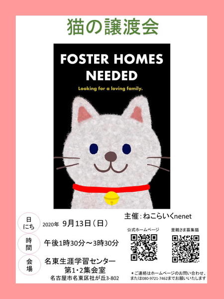 | イベント内容 | 保護猫の里親になりませんか? 《猫の譲渡会のお知らせ》 主催:ねこらいくnenet 日にち:9月13日(日曜日) 時間 :午後1時30分~3時30分 会場 :名東生涯学習センター 第1・2集会室 名古屋市名東区社が丘三丁目802 *専用の駐車場があります(300円/日) 満車の場合はすぐ横、公園駐車場(無料)の ご利用をおねがいします 〇譲渡会の見学は入場無料・予約不要です 〇保護猫は保護したあと、一定期間、体の状態を観察し、 トイレのしつけや基本的な健康診断を済ませています 〇それぞれの猫の特長や習慣など、現在の保護主より 説明をさせていただきます 〇参加猫はホームページ/募集猫たちで紹介しています https://nekolike.amebaownd.com/ (参加予定猫が体調不良などで急遽不参加になることもあります) ・当日に猫をお渡しすることはありません 後日、ご自宅までお届けに伺います ・1週間から2週間のトライアル期間後、正式譲渡となります ・完全室内飼い・ご家族全員の同意・治療費の一部ご負担などお願い事項があります ・詳しくはホームページ/譲渡についてをご覧ください https://nekonetwork.com/2020/03/31/03/58/35/2671/譲渡について/ *感染症の拡大防止に努めています 〇会場は窓を開放し、常に換気をしています 〇マスクの装着をお願いいたします 〇入り口には消毒薬を用意しています 〇会場内への入室は一定の人数とさせていただきます |