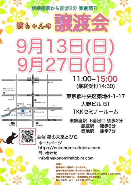 | イベント内容 | 東銀座で保護猫の譲渡会を開催しています「猫の未来とびら」です♪ 恵まれない環境にいる猫たちが未来へのとびらを開いて幸せなご縁に繋がる橋渡しをしていきます。 たくさんの猫ちゃんと保護主・スタッフ一同みなさまのご来場を心よりお待ちしています! 子猫ちゃん〜成猫ちゃんまで参加します♪ ご来場頂く方と私たち保護主、スタッフの安心と安全の為、感染リスクを限りなく低減させる為、私たちが出来うる対策をしてお待ちしております。 【ご来場いただく皆様には下記についてお願い致します】 ★マスクの着用をお願い致します。 (マスク着用のない方は入場出来ません) ★譲渡会場にお入り頂く前に手洗いと手の消毒をお願い致します。 ★ソーシャル・ディスタンス(人と人との間隔を開ける)をお願い致します。 ★熱のある方や体調の優れない方は譲渡会への来場を見合わせて頂けますよう、お願い致します。 ★来場者数によりましては人数制限もありますので長時間お待たせてする場合もございます。 予めご了承下さい。 ★見学だけの方は蜜を避ける為に来場をお断りさせて頂きます。 コロナウイルス感染拡大防止の為、このような厳しいお願いで大変恐縮ですが何卒ご理解とご協力、ご了承をいただけますようお願い致します。 ★☆★★☆★★☆★★☆★★☆★★☆★★☆★★☆★★☆★ ★開催日時 2020年9月13日(日) 11:00~15:00 (最終受付 14:30) ★会場 東京都中央区築地4-1-17 銀座大野ビル B1 TKKセミナールームさんにて (東劇となり) ★最寄駅 東銀座駅 6番出口 徒歩2分 銀座駅 徒歩9分 ・築地駅 徒歩7分 駐車場のご用意はございませんので近隣のコインパーキング等をご利用ください。 会場への直接のお問い合わせはご遠慮くださいませ。 ★☆★★☆★★☆★★☆★★☆★★☆★★☆★★☆★★☆★ 会場で猫ちゃんと触れ合ってご縁を繋いでください。 里親様・猫ちゃんが双方、幸せな家族になれるよう保護主・スタッフがサポート致します。 ご不安な事はお気軽にご相談ください。 入場無料です。事前のご予約は必要ございません。 ご希望の猫ちゃんがいらっしゃる里親希望者様は11時~11時30分までに会場へお越しください。 11時30分までに受付されたすべての里親希望者様と保護主がお話をさせて頂きます。 1匹に複数のお申込み、里親様と猫ちゃんに合うご家庭がございましたら 受付を終了する場合もございます。 里親様が決まっていない猫ちゃんに関しましては随時保護主とご相談ください。 当日猫ちゃんの引き渡しはございません。 後日、保護主が里親様宅へお届けいたします。 ※参加予定猫ちゃんは、急な体調不良等で不参加になる場合もございます。 開催当日の朝、当会ブログにて不参加の最新情報を掲載致しますのでご確認をお願い申し上げます。 ◇譲渡に関してのお願い・基本条件 1.家族の一員として終生最期まで愛育下さい。 2.完全室内飼い・ペット可のお住まい 3.脱走防止対策 4.避妊・去勢手術 5.里親様のご自宅へのお届け 6.譲渡誓約書への署名捺印・身分証明書の提示 7.医療費譲渡金のご負担 8.定期報告 9.トライアル期間有り ※保護主により譲渡条件は異なりますので会場で直接ご相談ください。 60才以上の方のみのご家庭、未成年の方、単身の方、同棲中の方、小学生低学年以下のお子様のいる方、 必要な脱走対策を施していただけない方は譲渡が難しい場合もございますのでご了承ください。 小さな子猫の譲渡は体重が1kgになってからのお届けやお留守番の無い(少ない)ご家庭を希望いたします。 医療費譲渡金に関しましては詳しくはホームページの 【譲渡に関してのお願い】【譲渡の流れ】をご覧くださいませ。 〜主催 猫の未来とびら〜 |