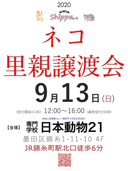 | イベント内容 | 錦糸町の専門学校日本動物21様のご協力により、同校舎でねこの里親譲渡会を開催させていただきます。 感染防止対策として、ご来場の際はマスク着用、入り口でのアルコール消毒、検温のご協力をお願いしております。 検温、問診票・アンケートへの記入をしていただきます。 『三密』を避けるため、以下のように対応させていただきます。 *会場入場者数は1回に20名前後になります *受付開始11:45/最終受付15:00 *窓を開けての外気換気を行いますので、猫さんをケージの外に出すことはできません *会場には待機場所のご用意はございません (当日の来場者数により、入場できない場合がございます) 以上、ご理解いただきますよう、お願いいたします。 参加ネコさんはこちらからご覧下さい。(随時更新) ↓ https://www.pet-home.jp/member/user360938/post/ 平井・小松川Shippoの会が投稿した里親募集 ●日時:9月13日(日)12:00~16:00(受付開始11:45/最終受付15:00) ●会場:専門学校 日本動物21 東京都墨田区錦糸1-11-10 4F ●アクセス:JR総武線・総武快速線「錦糸町駅」 北口徒歩6分 東京メトロ半蔵門線「錦糸町駅」 3出口徒歩6分 ※東京都墨田区錦糸1-2-1(アルカタワーズ)は同校の法人本部です。 里親譲渡会の会場ではございませんので、お間違いのないよう御願い致します。 子猫ちゃんたちも参加予定なので、小さい頃から一緒に暮らしたい、育てたいとお考えの方、ぜひお越しください! 男性の一人暮らしの方やご高齢の方にもぴったりの、まったりした大人猫さんたちも参加予定です。 きっと、運命の出会いがあると思います。 里親希望の皆さま、ぜひ、足をお運びください! ●参加猫および諸条件については、下記「ペットのおうち」からご覧ください。 (随時更新) https://www.pet-home.jp/member/user360938/post/ インスタグラム、更新中です https://www.instagram.com/hirakomashippo/ |