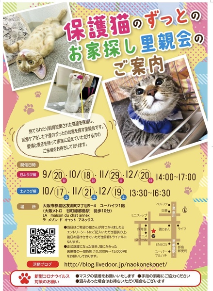 | イベント内容 | オープンシェルターにて、ユルユルと小規模の里親会ですがアットホームな雰囲気の中開催しております。怖がりさんでなければ、お散歩している猫さんを見て頂いたり、抱っこも短時間であればオッケーです。なるべく触れ合って頂き、しっかりとお話をさせて頂ける空間でと開催しております。 3ケ月位の子猫さんから、しっかり大人猫さんまでの沢山の保護猫さん達が参加いたします。ぜひご来場くださいね。 当里親会は猫さんの年齢層や性格によっては、単身者の方へも譲渡しております。ご相談だけでも大丈夫です!猫さんとの生活に対する不安などもしっかり解消した上で、飼育トライアルに進んで頂きたいと思います。 新型コロナウィルス対策としましてマスクの装着、手指の消毒をお願いしております。会場内が混み合いましたらお待ち頂く事がありますので、ご協力宜しくお願いいたします。 参加猫さん情報はブログ『annexニャンコのずっとのお家探し』をチェックして下さいねhttp://blog.livedoor.jp/naokonekonet/lite/ ・エントリーの際にご確認のため身分証明書のご提示のみ(コピーなどは頂戴いたしません)お願いしております。 ・当日は猫を連れ帰ることはできません。 ・正式譲渡になった際には、猫にかかった医療費の一部負担をお願いしております(10,000〜15,000円)。 9月20日(日)14時〜17時 大阪市都島区友渕町2-9-4 ユーハイツ1階 LA maison du chat annex 地下鉄谷町線 都島駅より徒歩10分 |