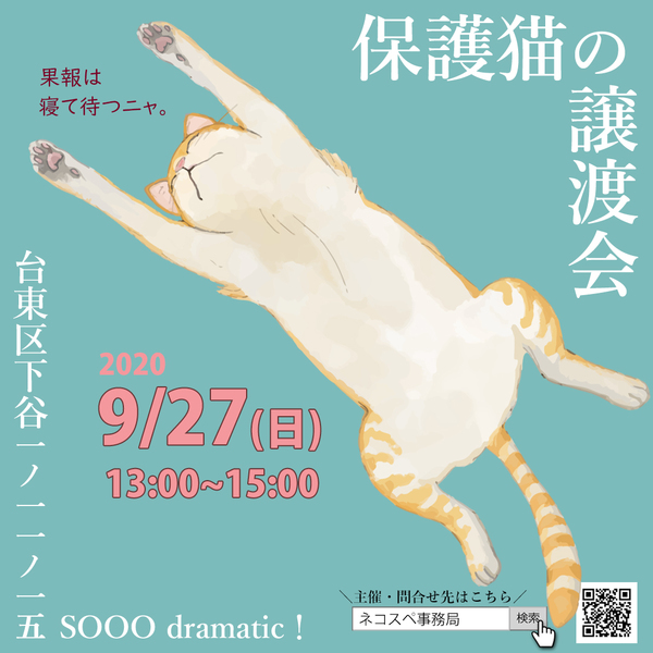 | イベント内容 | 110㎡の大きな会場で密を避け、保護猫の譲渡会を開催いたします。 個人が保護している猫たちが参加します。 参加猫は子猫を中心に約20匹を予定しています。 応募条件も譲渡費用もそれぞれ異なりますので、 気になる猫さんがいたら、担当者にお声がけください。 【会場について】 レンタルスペース「SOOO dramatic!」 https://sooo-dramatic.com/ 【交通案内】 ●東京メトロ日比谷線「入谷駅」2番出口から徒歩1分 ●JR山手線「鶯谷駅」南口から徒歩6分 ●「上野駅」入谷口から徒歩12分 ※会場の入り口は、大通り(昭和通り)の1本裏側です。 【新型コロナウイルス感染症への対策】 ・一度の入場はスタッフ含め 27 人です。 (ソーシャルディスタンス 2m 四方での換算) ・入場前に体温測定を行っていただき、37.5 度以上の場合は入場のご遠慮お願いいたします。 ・入場の際は、手指のアルコール消毒をお願いいたします。 ・マスクの着用をお願いいたします。 ・会場側の要請により、入場者全員の連絡先をご記入いただきます。 (個人情報は会場側が厳密に保持し管理します。必要に応じ公的機関へ提供され得ることをご了 承ください) |