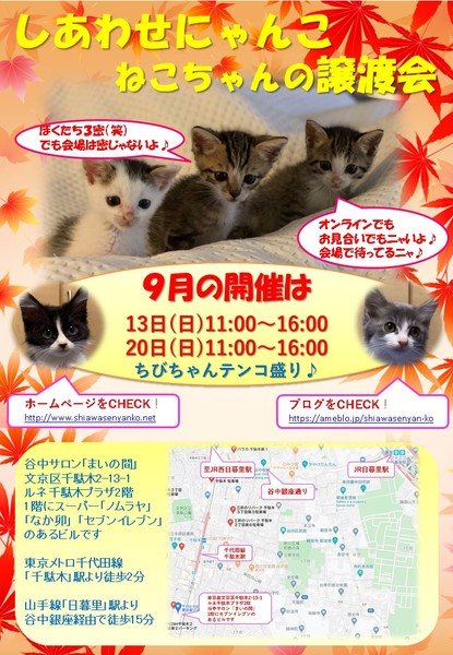 | イベント内容 | 「しあわせにゃんこ」は行き場のない猫ちゃんと里親様との出会いの場を提供するグループです♪ 子猫も成猫もハンデのある猫もみんな新しい家族を待っています♪ みなさまのご来場を保護主、スタッフ一同心よりお待ちしております♪ まだまだ残暑厳しいですが秋の夜長を にゃんことゆっくり過ごしませんか? 開催にあたりソーシャルディスタンスを守る為、各種制限等を設けております。 ※詳しくはブログをご確認願います。 https://ameblo.jp/shiawasenyan-ko/entry-12622897124.html 猫好きの聖地「谷根千」にて皆様のご来場をお待ちしております♪ ◆開催日/開催時間◆ 2020年9月13日(日) 11:00~16:00 ご希望の猫ちゃんがいらっしゃる場合は11時30分までに受付をお願い致します。 複数のお申し込みがある場合は11時30分で受付を終了させて頂く場合がございます。 受付をされた全ての里親様とお見合いをさせて頂きます。 ※先着順ではございません。 ※当日、猫ちゃんを連れて帰ることは出来ません。 後日調整のうえ保護主が里親様宅へお届けいたします。 ◆会場◆ 東京都文京区千駄木2-13-1 ルネ千駄木プラザ2階 谷中サロン「まいの間」 ※詳しいアクセスはHPをご覧下さい http://www.shiawasenyanko.net/jyoutokai.html 谷中サロン「まいの間」の情報はこちら http://neko-to-kyo.com/#maima ◆交通手段◆ 東京メトロ千代田線「千駄木」駅より徒歩2分 JR山手線「西日暮里」駅より徒歩12分 JR山手線「日暮里」駅より谷中銀座経由で徒歩15分 ※お車でご来場の際、駐車場のご用意はございません。 近隣のコインパーキング等をご利用ください。※近隣に沢山あります。 いつ里の掲載参加猫一覧はこちらから https://satoya-boshu.net/mypage/foster_list.php?@ps@=none アメーバブログの里親募集にゃんこはこちら https://ameblo.jp/shiawasenyan-ko/theme-10092719565.html ◆猫ちゃんとのお見合い◆ 掲載している猫ちゃんは基本的に譲渡会場でのお見合いのみとなります。 譲渡会への参加が決定している猫ちゃんはその譲渡会で里親様が決定しなかった場合のみ保護主宅でのお見合いが可能となります。 自宅お見合いを希望される里親様はメール(info@shiawasenyanko.net)にてご相談ください。 ◆当譲渡会では猫ちゃんと里親様のスキンシップを大切にしています◆ 新しい家族として20年以上いっしょに暮らしていく猫ちゃんです。 譲渡会場でたくさんの猫ちゃんと触れ合って良きパートナーを見つけてください。 はじめて猫ちゃんを迎える不安や先住猫ちゃんとのトライアルの注意点、猫ちゃんと里親様の暮らし方など気軽にご相談ください。 経験豊富な保護主や猫大好きスタッフがアドバイスさせていただきます。 ◆子猫ご希望の里親様◆ 子猫は急な下痢や発熱等により体調が急変し、数時間対応ができなかっただけでも命を落とす事があります。 その為、当譲渡会では月齢によりお留守番のない又は少ないご家庭への譲渡に限らせて頂いております。 また里親様と子猫ちゃんが安心してトライアル期間を過ごせるよう体重が1㎏程になってからのお届けとさせて頂いております。 ◆里親希望のみなさまへ◆ ご家族の皆様で生涯、家族の一員としてたっぷり愛情を注いでくださるご家庭をお待ちしております。 下記に該当する希望者様へ ・独身、単身者の方 ・友人同士、同棲でのお住まいの方 ・高齢者のみのご家庭の方 は、ご相談の上、譲渡を判断させて頂きます ・適正飼育の不可能な方 ・脱走防止対策にご協力頂けない方 ・定期報告の不可能な方 は、ご遠慮下さいますようお願い致します ◆ご負担頂く費用について◆ 譲渡の際に譲渡負担金(医療費の一部、譲渡金、お届け時の交通費)を里親様にご負担頂く事により 過酷な状況にいる猫ちゃんを保護し新しいご家族の元へ送り出す事ができています。 皆様のご理解とご協力にボランティア一同、心より感謝しております。 ご負担頂く医療費につきましてはホームページに詳しく記載させて頂いております。 http://www.shiawasenyanko.net/onegai.html しあわせにゃんこホームページ http://www.shiawasenyanko.net メールでのお問い合わせ info@shiawasenyanko.net |