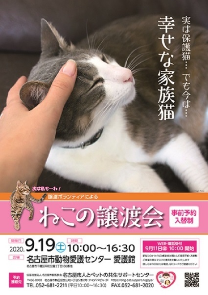 | イベント内容 | 名古屋市動物愛護センター 譲渡ボランティアによる猫の譲渡会を開催します。 たくさんの子猫、若猫、大人猫が参加します。入場は無料ですが、新型コロナウィルスの影響で、感染防止対策として来場者数を制限するために時間指定の予約制度を導入し開催させていただきます。 参加予約は下記の専用のページからお願いします。 https://dog-cat-support.nagoya/handover-party/cat/ サクラねこ名古屋は13時~14時半に参加させていただきます。 ご予約お待ちしております! 名古屋市 人とペットの共生サポートセンター https://dog-cat-support.nagoya/enlightenment/detail.html?id=7 |