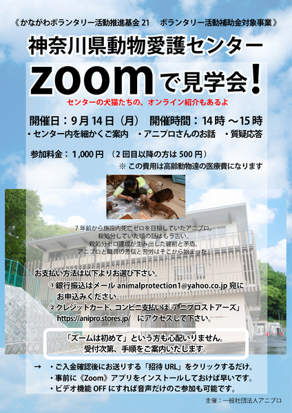 | イベント内容 | ご自宅からオンラインで参加できる動物愛護センター見学会。今回は第2回。 ・センター内のご案内。 ・アニプロさんによる保護現場のお話と質疑応答。 ぜひご参加ください! お申し込みはアニプロHPへ → http://www.ani-pro.org/ |