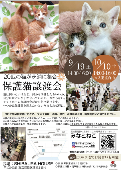 | イベント内容 | 年間200匹以上の譲渡を行なっている、みなとねこが田町駅芝浦口で譲渡会を開催します。 できれば預かり宅で普段の元気いっぱいな姿をみていただきたい。けれど、ご希望の方全員にお越しいただくのは難しい。 里親希望の方にしても一度見てから考えたい、わざわざお見合いに行ってしまうと断りづらいんじゃないかというお気持ちもあると思います。 そこで毎月譲渡会を行なってきました。 7月からは地元港区内の素敵なレンタルスペースで開催しています。 今回は子猫中心に20匹程度、生後2-10ヵ月、大人猫も参加します。 みなとねこは今後もまだまだたくさんの子猫の保護の予定があります。また子猫をお迎えいただくにはそれなりにご準備も必要ですので、今すぐは難しい方にもご希望の猫の条件をお伺いして、該当の猫が出てきたらご紹介という形で今まで以上にスピーディーでかつミスマッチのない譲渡を目指します。 みなとねこは子猫は2匹ペアでの譲渡が原則です。 初めての方こそ最初から2匹をお勧めしています。 また新型コロナの感染拡大防止の観点から混雑時は入場をお待ちいただいたり、 マスクの着用と消毒のご協力をお願いしております。換気のためにドアをオープンしての開催のためにケージ越しでのご対面となりますことご理解ください。 実際の参加予定猫は9/18(金)20:00までにFacebookページでご紹介します。 https://m.facebook.com/minatoneco/ |