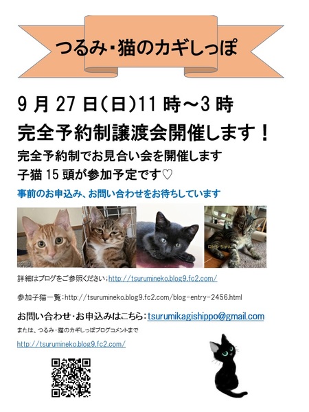 | イベント内容 | コロナ感染が再び拡大しているため 9月の譲渡会も前回と同じく 完全予約制で行うことになりました。 第73回 つるみ・猫のカギしっぽ譲渡会 気になる子がいらした方はこちらまでメールで お問い合わせお願いいたします。 tsurumikagishippo@gmail.com 参加猫については順次掲載してまいります。 参加猫の一覧はこちらをクリックしてください http://tsurumineko.blog9.fc2.com/blog-entry-2456.html ご来場までの手続きとして: *どの子に会いたいかをお申し出いただき、 *ご環境、譲渡条件などの確認をさせていただいたのちに 予約時間のご相談となります。 ・申し訳ありませんが、すべての子を見るということは 完全予約制の今回は難しいかと思われます。 あらかじめ第一第二候補を決めていただき 予約時間を決めさせていただくためです お問い合わせのメールには 以下の点をご記入いただけると助かります: ・ご当人さまのご年齢 お住まいの地域(市町までで結構です) ・ご家族構成とご年齢 ・住宅環境:持ち家(集合住宅または一戸建て)か賃貸か、 また集合住宅では「ペット可」と明記された部分のコピーが必要です ・お留守番の有無、時間 ・ご家族さま全員の積極的ご賛同を得られているかどうか 簡単に子猫の譲渡条件をお知らせさせていただきます ・1年くらいはお世話できる大人の留守番があまりないこと (買い物などは除外、勤務時間のことです) ・持ち家一戸建て以外の住環境では、ペット可物件であること、 またペット可について明記された部分のコピーが必要です ・何より大人が猫を飼いたいと思っておられること、 お子様の希望・情操教育のためでないこと ・ご家族全員の積極的ご賛同を得られていること ・オス、メスそれぞれ適切な時期に必ず不妊手術をしていただけること、 またそのご報告をいただけること *低年齢のお子様では特に、「猫アレルギー」の検査を 事前に済ませていただいていること ⇒これは近年お子様がたのアレルギーが多発しており、 せっかく仲良くなったお子様と猫がお別れしなければならない事例が 数件あったため、ぜひお願いするようになっています |