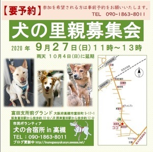 | イベント内容 | 屋外会場です。 雨天時は10月4日に延期予定です。 雨天時の判断は、ご予約いただいた方に直接お伝えします。 ※コロナウイルス対策として、密集を避けるために予約制にしています。 犬の負担を考えて早めに終了する場合がありますので、ご来場予定の方は必ず事前にご連絡ください。 ※先住ワンちゃんがいる場合は、相性を見るためにも是非連れてきてください。 ※ブログで保護犬情報を紹介しています。 【予約・問合せ】 |
