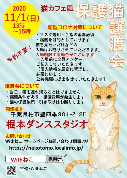 | イベント内容 | 広いダンスフロアでの譲渡会です。 2020年11月1日(日) 13時~15時 ※予約不要 千葉県柏市豊四季301-2 2階 根本ダンススタジオ ☆入場無料(ただしお気持ちだけご寄付お願いします) 入場の際 アンケートをご記入いただきます。ご記入していただかない方は入場できません ☆当日猫を連れ帰ることはできません ☆譲渡条件あります。譲渡費用発生します。 ☆新型コロナウィルスの関係で急遽中止になる場合がございます。 その場合はHPまたはSNSに掲載しますので必ずご確認の上 お出かけください ☆開催する場合も マスクは必須でお願いします。手の消毒もお願いします ☆ Withねこ https://nekotomo.localinfo.jp/ ◆猫を出したい 保護猫活動者参加も受け付けます。 ホームページお問い合わせ画面からお問い合わせください。 |