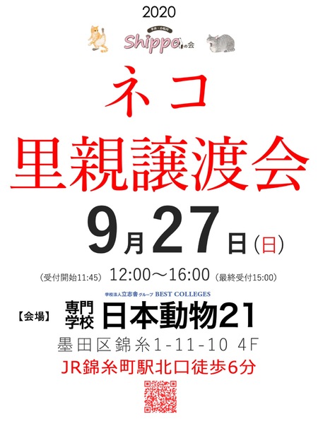 | イベント内容 | 東京 錦糸町の専門学校日本動物21様のご協力により、同校舎で猫の里親譲渡会を開催させていただきます。 感染対策として、ご来場の際は「マスク着用」「入り口でのアルコール消毒」「検温・アンケート・問診票の記入」のご協力をお願いしております。 【開催時間】 ●11:45受付開始、12:00開場 ●15:00最終受付、16:00閉場 『三密』を避けるため、以下のように対応させていただきます。 *会場入場者数を制限する場合がございます *窓を開けての外気換気を行いますので、猫さんをケージの外に出すことはできません *会場には待機場所のご用意はございません ご理解いただきますよう、お願いいたします。 猫さんの状況により、当日不参加になる場合があります。 当日ご希望の猫さんを連れて帰ることはできません。 トライアル決定後、後日ご自宅までの送り届けとなります。 参加猫さんはこちらからご覧下さい。(随時更新) https://www.pet-home.jp/member/user360938/post/ https://www.pet-home.jp/member/user247571/post/ 子猫ちゃんたちも参加予定なので、小さい頃から一緒に暮らしたい、育てたいとお考えの方、ぜひお越しください! 男性の一人暮らしの方やご高齢の方にもぴったりの、まったりした大人猫さんたちも参加予定です。 きっと、運命の出会いがあると思います。 里親希望の皆さま、ぜひ、足をお運びください! ●日時:9月27日(日)12:00~16:00(入場受付:11:45、最終受付15:00) ●会場:専門学校 日本動物21 墨田区錦糸1-11-10 4F ●アクセス:JR総武線・総武快速線「錦糸町駅」 北口徒歩6分 東京メトロ半蔵門線「錦糸町駅」 3出口徒歩6分 ※東京都墨田区錦糸1-2-1(アルカタワーズ)は同校の法人本部です。 里親譲渡会の会場ではございませんので、お間違いのないよう御願い致します。 ●参加猫および諸条件については、下記「ペットのおうち」からご覧ください。(随時更新) https://www.pet-home.jp/member/user360938/post/ ☆譲渡には当会における一定の条件があります。 ☆当会および里親譲渡会についてのお問い合わせ ☆外猫、保護猫のために物資のご支援を頂ける方がおりましたら、送付先をご連絡させて いただきますのでご連絡下さい。 ☆預かりボランティアさん、活動のお手伝いをして頂ける方も随時募集中です。 hilakoma@yahoo.co.jp |