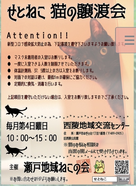 | イベント内容 | さぁ!楽しい譲渡会★ 今月も張り切って開催しますよッ! 子猫から大人猫まで、いろんな柄の可愛い子達が参加します。 コロナ感染拡大防止対策もバッチリです。 ・ご自宅にて体温計測をし、37.5℃以上の方はご来場をお控えください。 ・お越し頂いた方のお名前とお電話番号を控えさせていただきます。 ・定期的に換気をします。 ・スリッパご持参でお越しください。 ・一度に入室する人数を制限させていただきます。 ご不便をお掛けする事もあるかもしませんが、ぜひ遊びに来てくださいね! |