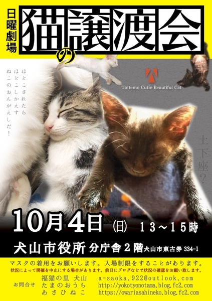 | イベント内容 | 【ココがポイント!】 ★健康診断、ウイルスチェック済み!駆虫当然! ★感染症予防対策やります! マスクの着用をお願いします! 20匹ほど参加予定です。 【日時】 10月4日 (日) 13時~15時 【場所】 犬山市役所 分庁舎 2階 (犬山市東古券334ー1) 予約不要 駐車場あり 【ブログでチェックどうぞ】 あさひねこ http://owariasahineko.blog.fc2.com/ たまのおうち http://yokotyonotama.blog.fc2.com 福猫の里 犬山「福猫の里便り」 https://hukunekonosato.hatenablog.com/ 問い合わせ先(福猫の里 犬山) a-saoka.922@outlook.com ーーーーーーーーーーーー 【感染予防対策】 ★入口で手の消毒あり ★マスクの着用をお願いします ★入場制限する場合があります ★猫と猫の間をあけます。 ★保護主との距離も取ります ★定期的に換気をします 【お約束】 当日、会場での猫の引き渡しはしておりません。 後日ご自宅までお届けします。 お試し飼育(トライアル)を1週間ほどして頂き、双方が納得の上で正式譲渡となります。 譲渡の際は、医療費の一部の負担をお願いしております。 (ワクチン代 等) ・ペット可のお住まい ・完全室内飼育、終生飼育 ・適切な医療措置 ・不妊手術の実施と報告 等、お約束があります。 ☆可愛い猫達が暖かい家族を待っています☆ ☆ぜひお越し下さい☆ |