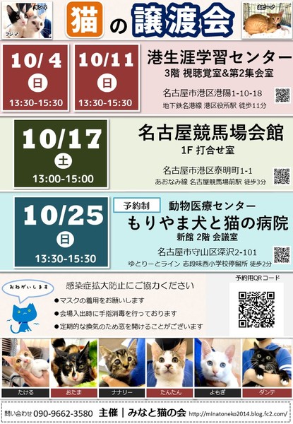 | イベント内容 | =みなと猫の会 第253回譲渡会のお知らせ== 新しい家族を待つ猫たちに 会いに来ませんか? ◆ペットショップへ行く前にぜひ譲渡会へ◆ トイレトレーニングや 基本的な健康診断を終わらせた 猫たちが大集合! ○主 催 みなと猫の会 ○日 時 10月25日(日) 13:30~15:30 ○場 所 動物医療センターもりやま犬と猫の病院 新館2F 会議室 名古屋市守山区深沢2-101 ゆとりーとライン 志段味西小学校バス停留所 徒歩2分 【会場Map】https://goo.gl/maps/oPzQu3PWqE32 ※来場予約制です お申し込みは→https://select-type.com/rsv/?id=FsEE1-K8ka0 ※車でお越しの場合は 病院第2・第3駐車場をご利用ください ※お問い合わせは会場ではなく minatonekonokai@gmail.comもしくは 090-9662-3580 までお願いします ○参加猫について ・参加している猫は、ワクチンや駆虫等の基本治療を済ませています。 また、年齢に応じて避妊去勢手術を行っています。 ・参加予定猫が体調不良などで急遽不参加になることもあります。 ○ご来場の皆様へ ・譲渡会の見学は入場無料です。 ・当日に猫をお渡しすることはありません。 後日ご自宅までお届けに伺います。 ・一週間から二週間のトライアル期間後、正式譲渡となります。 ・トライアル及び譲渡の際には 完全室内飼い・ご家族の同意・脱走防止策・ アンケート記入など諸条件がございます。 ・里親様には治療費の一部ご負担をお願いしております。 これ以上不幸な猫を増やさないための 治療費とさせて頂きますので何卒ご理解ください。 ・非会員の個人保護者も参加しています。 譲渡条件やトライアルは猫の保護者に準じます。 ・譲渡会の流れ http://minatoneko2014.blog.fc2.com/blog-entry-11.html ○参加猫情報は随時更新中! ↓↓参加猫一覧↓↓ http://minatoneko2014.blog.fc2.com/blog-entry-493.html ○猫に関する相談も受け付けています ねこについての困りごと、トラブルなどを抱えている方、 相談へいらっしゃいませんか。 ○次回以降の譲渡会予定 日時:11月1日(日)13:30-15:30 場所:港生涯学習センター 3階 視聴覚室&第2集会室 名古屋市港区港陽1丁目10-18 地下鉄名港線「港区役所」駅より徒歩9分 日時:11月8日(日)13:30-15:30 場所:港生涯学習センター 3階 視聴覚室&第2集会室 名古屋市港区港陽1丁目10-18 地下鉄名港線「港区役所」駅より徒歩9分 ◎主催者ブログ みなと猫の会 ~こぴっと猫だより~ http://minatoneko2014.blog.fc2.com/ ◎参加者のブログ myままさんブログ「にゃんこの宝箱」 http://wagayamama.cocolog-nifty.com/jiru/ 犬白ママさんブログ「犬白日記」 http://k531.blog25.fc2.com/ uzumakinecoさんブログ「猫ときどき雨」 http://uzumakineco.blogspot.jp/ sion1226さんブログ「さとおやさがし」 http://sion1226.blog.fc2.com/blog-entry-1.html ■上記ブログに会ってみたい猫がいた!でも参加予定猫に入ってない、 どうすればいいの? ■譲渡会当日は都合が悪くて… それ以外の日に猫とお見合いがしたい! などのお問い合わせは minatonekonokai@gmail.com まで 〇感染症の拡大防止にご協力願います ※会場入出時の手指消毒にご協力ください ※定期的に換気作業を行います ※マスク等の装着をお願いいたします 写真1枚目 ダンテ ♂ 3~5才 人馴れ抜群のモフモフ長毛 両手に小さな白手袋をしています ☆★個性豊かな猫たちが皆様をお迎えします★☆ 猫とスタッフ一同、お待ちしております。 |