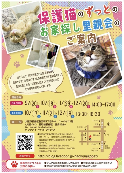 | イベント内容 | オープンシェルターにて、ユルユルと小規模の里親会ですがアットホームな雰囲気の中開催しております。怖がりさんでなければ、お散歩している猫さんを見て頂いたり、抱っこも短時間であればオッケーです。なるべく触れ合って頂き、しっかりとお話をさせて頂ける空間でと開催しております。 3ケ月位の子猫さんから、しっかり大人猫さんまでの沢山の保護猫さん達が参加いたします。ぜひご来場くださいね。 当里親会は猫さんの年齢層や性格によっては、単身者の方へも譲渡しております。ご相談だけでも大丈夫です!猫さんとの生活に対する不安などもしっかり解消した上で、飼育トライアルに進んで頂きたいと思います。 新型コロナウィルス対策としましてマスクの装着、手指の消毒をお願いしております。会場内が混み合いましたらお待ち頂く事がありますので、ご協力宜しくお願いいたします。 参加猫さん情報はブログ『annexニャンコのずっとのお家探し』をチェックして下さいねhttp://blog.livedoor.jp/naokonekonet/lite/ ・エントリーの際にご確認のため身分証明書のご提示のみ(コピーなどは頂戴いたしません)お願いしております。 ・当日は猫を連れ帰ることはできません。 ・正式譲渡になった際には、猫にかかった医療費の一部負担をお願いしております(10,000〜15,000円)。 10月18日(日)14時〜17時 大阪市都島区友渕町2-9-4 ユーハイツ1階 LA maison du chat annex 地下鉄谷町線 都島駅より徒歩10分 |