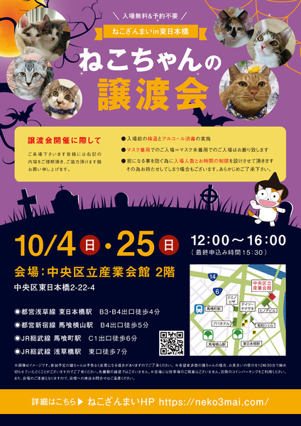 | イベント内容 | ~保護ねこちゃんを家族に迎えませんか?~ 「猫も!里親さんも!保護主も!みんなが笑顔になれる」そんな譲渡会になると良いな♪ 猫ちゃんと里親の赤い糸のご縁結び、どうぞねこざんまいにお手伝いさせて下さい♪ 新しい家族と猫たちの生活が楽しく素敵な毎日でありますように。 そんな生活が送れるよう保護主のサポートも万全です! 【新型コロナウィルス感染予防対策について】 譲渡会開催に際し、ご来場下さいます皆様には以下の内容をご理解頂き、ご協力頂けます様お願い申し上げます。 ●入場前の検温とアルコール消毒の実施 ●マスク着用でのご入場=マスク未着用でのご入場はお断り致します ●入場人数の制限=一度に入場できるのは50名までとさせていただきます ●時間の制限=密になる事を防ぐ為にお時間の制限を設けさせて頂きます その為お待たせしてしまう場合もございます ●会場利用規約により、皆様のご連絡先を控えさせていただきます あらかじめご了承下さい。 里親様決定は14時以降となります。 決定された方は当日説明会にご参加頂きますので、お時間に余裕を持ってご来場下さい。 11:30より、2階会場入口にて受付を開始します。 受付時に入場予定時間が記入された整理券をお配り致しますので、 整理券を受け取った方はお時間になりましたら2階会場入口に番号順にお並び下さい。 ねこざんまい譲渡会は先着順の譲渡ではありません。 11:30より早くいらしても、お待ちいただく場所がございません。 また、近隣にお住まいの方や他階フロアのご利用者様にご迷惑となる場合がございますので、 受付開始時間にあわせてお越しくださいますよう、何卒ご協力お願い致します。 開催日 2020年10月4日(日)12:00~16:00(最終申込み15:30) 『 東日本橋会場 』 ☆☆☆予約不要・入場無料☆☆☆ 会場 中央区立産業会館2階 中央区東日本橋2-22-4 ※会場へのお問合せはご遠慮ください。 交通 都営浅草線 東日本橋駅 B3又はB4出口 徒歩4分 都営新宿線 馬喰横山駅 B4出口 徒歩5分 JR総武線 馬喰町駅 C1出口 徒歩6分 JR総武線 浅草橋駅 東口 徒歩7分 ※駐車場のご用意はございません。 近隣のコインパーキングをご利用ください。 ホームページ参加猫一覧はこちらから http://www.neko3mai.com/entrycats/entrycats.html ☆子猫希望の里親様☆ 子猫は下痢等により数時間対応ができなかっただけでも死に至る場合があります。 その為、ねこざんまいでは月齢によりお留守番時間の長さを制限させていただきます。 また、子猫ちゃん(6ヶ月未満)の里親様には子猫支援金のご協力をお願い致しております。 ☆ねこざんまいの譲渡会にご来場の里親様☆ 先着順ではございませんので、どうぞ譲渡会開始時間にご来場下さい。 ・譲渡会の流れはこちらから http://www.neko3mai.com/flow/flow.html ・譲渡の際にはいくつかのお約束事がございます。 http://www.neko3mai.com/condition/condition.html ・家族に迎える猫ちゃんが決まった場合、後日里親様のご自宅までお届けいたします。 当日に猫ちゃんをお渡しすることはできませんのでご了承ください。 ☆里親希望のみなさまへ☆ ご家族の皆様で生涯、家族の一員としてたっぷり愛情を注いでくださることを希望しています。 恐れ入りますが、 ・学生の方 ・一人暮らし、同棲中の方 ・子猫、若猫希望の60歳以上のみのご家庭 ・脱走防止対策にご協力いただけない方 上記の希望者さまにつきましては、原則譲渡を遠慮させていただいておりますのでご了承下さい。 ☆ご負担頂く費用☆ 譲渡の際に、医療費の一部、お届け時の交通費を里親様にご負担頂いております。 皆様のご協力により、より多くの猫達を救うことができております。 里親様の温かいお気持ちにボランティア一同、心より感謝いたしております。 ご負担頂く医療費につきましてはホームページに詳しく記載させて頂いております。 http://www.neko3mai.com/flow/flow.html ☆よくある質問☆ ・譲渡の条件 ・ご負担頂く費用 ・譲渡会の場所等は ホームページに詳しく掲載させて頂いておりますのでご覧ください。 https://neko3mai.com/ メールでのお問い合わせはすぐにご返答出来ない場合がございますのでご了承ください。 ホームページ https://neko3mai.com/ お問い合わせ http://www.neko3mai.com/contact/form_general.html ねこざんまいブログ http://ameblo.jp/neko3mai/ |