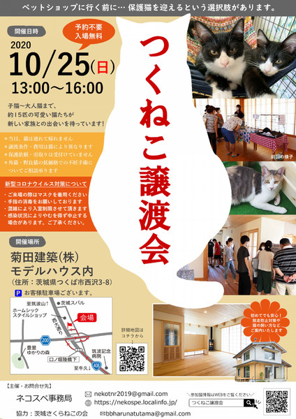 | イベント内容 | 保護猫をもっと身近に。 つくば市の工務店、菊田建築さんの協力を得て、 きれいなモデルハウスを1棟お借りし、保護猫の譲渡会を開催します。 譲渡会とは「猫を飼いたい人」と「飼い主のいない猫」がお見合いをする場です。 保護猫とは、ノラ猫が生んだ子や外では生きていけない子、飼い主に捨てられた子、 動物指導センターに持ち込まれた子など、新しい家族を探している猫たちの総称です。 保護ボランティアさんたちがそれらの猫に医療をかけ、家猫修行をさせて新しいお家へと巣立たせます。 ペットショップのほかに、保護猫を迎えるという選択肢も加えてください。 身寄りのいない猫たちが、ずっとの家族との出逢いを待っています。 「つくねこ譲渡会」 開催日: 10月25日(日) 時 間: 13:00~16:00 場 所: 菊田建築株式会社 モデルハウス (茨城県つくば市西沢3-8) 主 催: ネコスペ事務局 協 力: 茨城さくらねこの会 問合先: nekotnr2019@gmail.com |