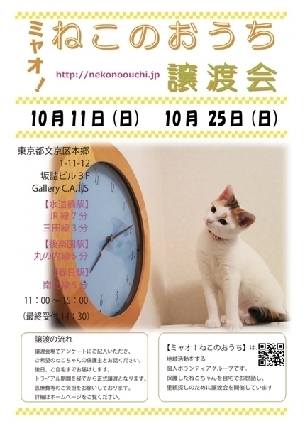 | イベント内容 | 参加する保護猫ちゃんについては、譲渡会一週間前からホームページにてご紹介しております。http://nekonoouchi.jp/ 事前予約はできません。譲渡会場でお会いしましょう。 【新型コロナウイルス対策について】 会場受付にて、以下の点をお願いする予定です。 ✿マスクの着用 ✿手洗いと消毒 ✿連絡先のご記入 御来場者多数の場合には入場制限を設けさせていただきます。 ※当日沢山のご来場者様がいらっしゃった場合、 整理券をお渡しする事がございます。 会場外で長時間お待たせする場合もございますが ご理解くださいますようお願い致します。 皆さまの長時間の在室を避ける為、 希望者様へは後日のご連絡とさせて頂きます。 ※ 感染防止対策時の特例となります。 ◇譲渡に関してのお願い 【ミャオ!ねこのおうち】では譲渡に際して、以下の要件をお願いしております。 ・完全室内飼いで終生愛育 ・脱走させないための対策 ・不妊去勢手術 ・譲渡誓約書の取り交わし ・医療費の一部ご負担 ・記念の写真撮影 ※60才以上の方のみのご家庭、独身や、経済的に困難な世帯、 必要な脱走対策を施していただけない方には原則的に譲渡はご遠慮頂いております。 また、保護主により譲渡条件が異なる場合もございますので会場でご相談ください。 参加予定ねこちゃんは、急な体調不良などで不参加になる場合もございます。 【譲渡に関してのお願い】・【医療費の一部のご負担】・【譲渡までの流れ】など 詳しくは下記ホームページをご覧くださいますよう宜しくお願い致します。 ミャオ!ねこのおうち譲渡会 ホームページ http://nekonoouchi.jp 公式facebookページ https://www.facebook.com/myaoneko.ginza/ 公式instagram https://www.instagram.com/myaoneko.ginza/ |