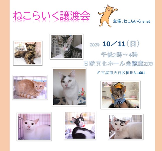 | イベント内容 | 《猫の譲渡会のお知らせ》 生後2か月の子猫からおとな猫まで 個性がかわいらしい猫たちです 猫を見て、触って、それぞれの良さをゆっくりと 確かめてください=^_^= 日にち:10月11日(日曜日) 時間 :午後2時~4時 会場 :日映文化ホール会議室206 名古屋市天白区植田3-1601 主催:ねこらいくnenet *建物前に専用の駐車場があります 満車の場合は、近隣のコインパーキングを利用ください 〇譲渡会は入場無料・予約不要です 〇まだ、飼えないけれど見てみたい、 猫に触れるのは初めて、 実際に猫を見てから考えたい 飼育の仕方について質問したい・・・など すぐに決められない方でも結構です ぜひ、譲渡会におこしください 〇室内飼い、家族全員の同意、治療費の負担など お願いごとがあります 〇1~2週間のお試し飼育期間があります 〇当日、猫を連れて帰ることはできません *感染症対策を実施しています ・会場入出時の手の消毒にご協力ください ・常時、窓を開け換気をしています ・スタッフはマスクを着用し、ご入場の方にもマスクの着用を お願いしています |