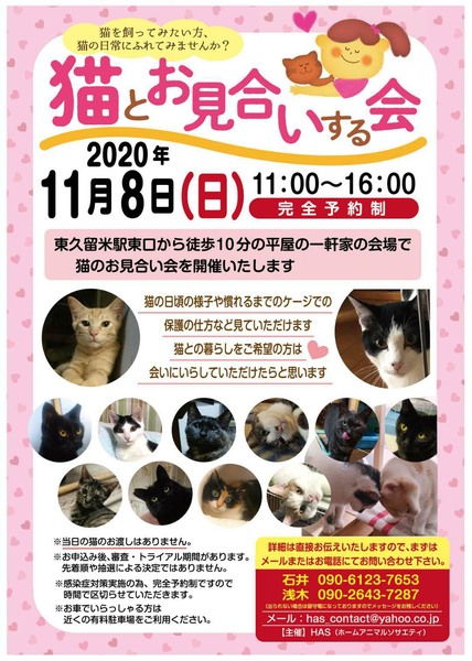 | イベント内容 | HASのシェルターにて保護猫とのお見合い会を開催します。 新型コロナウィルス対策のため、安心してゆっくりと猫達に会えるように時間を区切って完全予約制にいたしました。 皆様のご応募をお待ちしています。 |