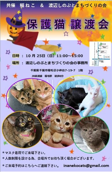| イベント内容 | 個人ボランティアの集まりである「稲ねこ」と「渡辺しのぶとまちづくりの会」の共催で、家族のいない猫達の本当の家族探しをしています。 実際に一緒に暮らしているボランティアから どのような性格な子なのか、どんな事が好きで、どんな事が苦手か等、直接お話しをお聞き頂けます。猫を飼うのが初めての方でも トライアル前から正式譲渡 以降も色んな相談をお受けしていますので安心して迎えて頂けると思います。 ぜひ家族の一員として保護猫を迎えたいとお考えの方、お待ちしております。 | ||