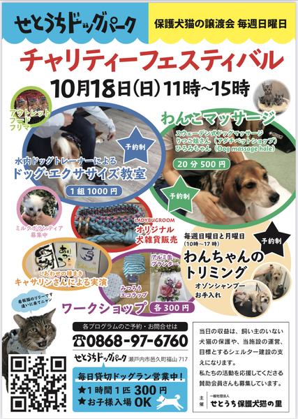 | イベント内容 | 当日の収益は飼い主のいない犬猫の保護や、当施設の運営、目標としているシェルター建設の支えになります。 私たちの活動を応援してくださる賛助会員さんも募集しています。 主催:一般社団法人 せとうち保護犬猫の里 ★コロナ対策のため、ボランティアは全員マスク着用にて対応させて頂きます。 ご来場くださる方も、申し訳ございませんが、マスク着用にてお願いいたします。 また、入り口にアルコール消毒液を用意しますので、会場への入退場の際には必ずアルコール消毒をお願いいたします。 発熱のある方、体調の悪い方については、ご来場の自粛をお願いします。 時間帯によってはお待たせすることがあります。大変申し訳ありませんがご理解、ご協力の程、宜しくお願い致します。 里親募集中の猫ちゃん。 →http://ienakiwan2018.blog.fc2.com/blog-category-2.html 里親募集中の犬ちゃん。 →http://ienakiwan2018.blog.fc2.com/blog-category-7.html ★全ての子が参加するとは限りませんので気になる子がおりましたらブログコメント欄からお問い合わせをお願い致します。 せとうちドッグパークさんへの行き方↓ https://www.dogcat-hogo.com/%E3%83%89%E3%83%83%E3%82%B0%E3%83%91%E3%83%BC%E3%82%AF/%E3%82%A2%E3%82%AF%E3%82%BB%E3%82%B9/ |
