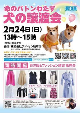 | イベント内容 | 2月24日 YCDなんくる倶楽部 いのちのバトンわたす犬の譲渡会(第10回)寝屋川市(株)アド・センで開催(屋内開催) 【日時】 2019年2月24日(日) 13時~15時 【会場】 株式会社アド・セン 屋内駐車場 〒572-0024 大阪府寝屋川市石津南町8の8 (会場はエアコンが入ります。雨天決行) 沖縄県離島の犬を中心に保護・譲渡している個人保護主の新たな取り組みとして犬の譲渡会をすることになりました。http://ycdclub.blog.fc2.com/ 今回は、お洋服のセレクトショップの即売会も同時開催です。 チャリティーフリマもします。 kagawa.dog.catさんの保護犬も参加します。 ●中型犬 子犬・成犬が参加します。 ●駐車場はありますが台数に限りがあります。 ●先住犬との相性をみてもらえるように、犬をつれて来場していただけます。必ずリードをつけて下さい。 ●会場敷地内に限りますが「お試し散歩」で実際にリードを持って歩いていただけます。 ※会場での事故については、主催者は一切責任を負いません。車の出入りにはご注意ください。 愛犬を連れて来場される飼い主さんは、ご自分の犬から目を離さないでください。 会場周辺の住宅街での犬の排泄はご遠慮ください。(会場そばに草地がありますのでお尋ねください) 子供さんが機械などにお手を触れないようご注意ください。 ●犬の紹介はブログに掲載していきます。(その他写真参加犬や一時預かりさん募集犬の掲示もします) ブログ「YCDなんくる倶楽部」 http://ycdclub.blog.fc2.com/ 【参加犬】 ●ライラちゃん(MIX 薄い赤毛 6か月 メス 避妊済 現在8kg) ●熊吉くん(琉球犬MIX 黒虎 1~2歳 オス 去勢済 13.5kg) ●サニーくん (MIX 茶白 胸は白いタキシード柄 2~3カ月 オス) ●いとちゃん (MIX クリーム色 メス 2~3カ月) ●はるちゃん (MIX茶色 メス 3か月) ●熊くんと月ちゃん (MIX 黑くて胸に白いタキシード 3カ月くらい) ●ハクくん (MIX 白 オス 6か月) ●アンジーくん (MIX 茶白 オス おじさん) ●ハイジちゃん (MIX 白 メス おばさん未満) ●ちびくん (四国犬 9歳 オス) ※その他、もうすぐ来る犬・一時預かりさん募集犬の掲示板なども設置します 【問合せ】ブログ「YCDなんくる倶楽部」にコメントしてください。 (緊急連絡先)090-2045-6384 ★(株)アド・センさんのご好意で会場を提供していただきました。アド・センさんへのお問い合わせはしないでください。 ●今後の譲渡会予定 2/17(日)午前 高槻市保健所での犬猫譲渡会に参加 2/24(日)午後 寝屋川市(株)アド・センで譲渡会を開催 3/17(日)午前 高槻市保健所での犬猫譲渡会に参加 3/31(日) 高槻市 安満遺跡公園での合同譲渡会に参加 |