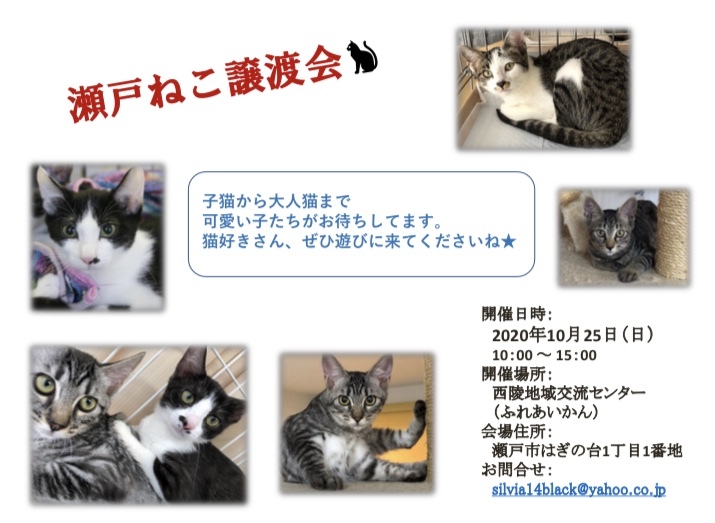 | イベント内容 | さぁ!楽しい譲渡会★ 今月も張り切って開催しますよッ! 子猫から大人猫まで、いろんな柄の可愛い子達が参加します。 コロナ感染拡大防止対策もバッチリです。 ・ご自宅にて体温計測をし、37.5℃以上の方はご来場をお控えください。 ・お越し頂いた方のお名前とお電話番号を控えさせていただきます。 ・定期的に換気をします。 ・スリッパご持参でお越しください。 ・一度に入室する人数を制限させていただきます。 ご不便をお掛けする事もあるかもしれませんが、ぜひ遊びに来てくださいね! |