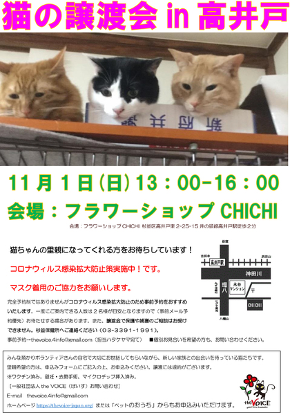 | イベント内容 | 「猫の譲渡会 in 高井戸」 会場:杉並区高井戸東2丁目25−15 日時:11月1日(日)13:00~16:00 猫ちゃんの里親になってくれる方をお待ちしています! 猫と暮らしてみたい方、興味はあるけれど、保護猫のことを良く知らないし…という方も、一度様子を見にいらっしゃいませんか? また、ボランティアに興味のある方も合わせてお待ちしています。 コロナウィルス感染拡大防止策実施中!です。 マスク着用のご協力をお願いします。 完全予約制ではありませんがコロナウィルス感染拡大防止のため事前予約をおすすめいたします。一度にご案内できる人数は2名様が目安となりますので(事前メール予約優先)お待たせする場 合があります。 譲渡会では保護や捕獲のご相談はお受けできません。その場合は杉並保健所へご連絡ください(03-3391-1991)。 譲渡会の事前予約→thevoice.4info@gmail.com(ハタケヤマ宛て) ■個別お見合いを希望の方は、上記メールアドレスまで別途お問い合わせください。 一般社団法人the VOICE(ぼいす)が保護している保護猫と、その他の保護猫が出場します。 譲渡には保護主によって譲渡規約があり、内容が多少異なりますので説明をよく聞いてご検討ください(例)。 ■終生飼養、完全室内飼、ケージの購入などの室内環境の整備、医療費負担、誓約書への署名捺印など ■当日、猫のお引渡しはありません。審査の後、後日お届けとなります。 ■猫の健康状態その他の理由により出場猫が変更となる場合があります。 |