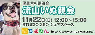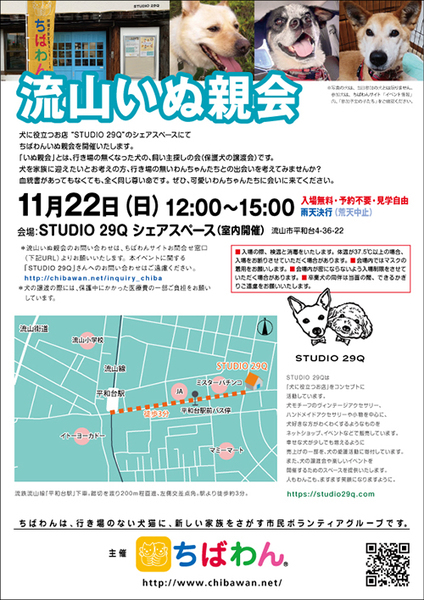 | イベント内容 | 犬に役立つお店 “STUDIO 29Q”のシェアスペースにて第4回 流山いぬ親会を開催いたします。 「いぬ親会」とは、行き場の無くなった犬の、飼い主探しの会(保護犬の譲渡会)です。 犬を家族に迎えたいとお考えの方、行き場の無いわんちゃんたちとの出会いを考えてみませんか? 血統書があってもなくても、全く同じ尊い命です。 ぜひ、可愛いわんちゃんたちに会いに来てください。 ■いぬ親会見学は予約等必要ありません。無料でどなたでも入場できます。 皆様のお越しをお待ちしております。 ※ネットによる募集も並行して行っているため、 当日までに決定・不参加となる場合もあります。 ※イベントバナーに写真が掲載されている犬が参加するとは限りません、参加犬は本サイトに順次掲載されますのでそちらをご確認ください。 【ちばわんからのお願い】 ①会場内ではマスクの着用をお願いします。 ②入場の際、検温と消毒をさせていただきます。体温が37.5℃以上の場合、入場をお断りさせていただく場合があります。 開催日時:11月22日(日)12:00~15:00 室内開催:雨天決行 (荒天中止) 場所:STUDIO 29Q シェアスペース 住所:千葉県流山市平和台4-36-22 【会場アクセス】 流鉄流山線「平和台駅」下車。踏切を渡り200m程直進、左側交差点角。駅より徒歩約3分。 駐車場はございません。当日お車の方は近隣のコインパーキングをご利用ください。 【注意事項】 《ご来場される皆様へのお願い》 臆病な性格の犬や、子供さんを苦手とする犬も参加しています。いきなり触ったりせず、まずボランティアに声をかけてください。 お子様と一緒にご来場される際には、手を繋ぐなどして頂き、お子様だけで参加犬に近づくことのないようご注意ください。 会場に同伴される犬には、必ずリード(引き綱)をつけてください。 【当日の流れ】 (1)家族募集中のいぬとお会いになりたい方はどなたでも自由にご参加いただくことができます。ちばわんボランティアは名札をつけておりますので、ご遠慮なくお声をかけて下さい。また、募集中のいぬのそばには預かりボランティアが控えておりますのでいぬの性格や生活習慣など、遠慮なくご質問ください。 (2)ご希望のいぬが決まったら、お申し込みアンケートにご記入の上、ボランティアにお渡し下さい(前日までにメールでアンケートを送信してお申し込みいただくこともできます。) ◆「いぬ」アンケート送信先:http://chibawan.net/contactform_dog (3)アンケート内容を拝見し、お話させていただきます。 (4)原則として3日以内にお返事の連絡をさせていただきます。 (5)ご縁が成立した場合には、後日、こちらからご自宅までいぬをお届けし、約1ヶ月のお試し生活に入っていただきます。お届けの際に、書面での譲渡契約書を交わします。 ※ワクチン・不妊手術代など保護犬にかかった費用は、家族になるいぬ親さんにもご負担をお願いしています 【お知らせ】 ◆会場ではチャリティグッズを販売します いぬ親会について:http://chibawan.net/inquiry_chiba ※いぬ親会当日はメールが見れません。また、お問い合わせの際は、必ず「具体的な件名」を入れて多数の迷惑メールと区別がつくようにお願いいたします。 ※本イベントに関するSTUDIO 29Qさんへのお問い合わせはご遠慮ください。 流山いぬ親会イベントページ https://chibawan.net/event/20201122-nagareyama-dog ちばわんホームページ http://chibawan.net/ |