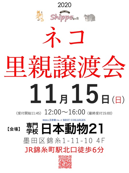 | イベント内容 | 東京 錦糸町の専門学校日本動物21様のご協力により、同校舎にて猫の里親譲渡会を開催させていただきます。 参加猫さんはこちらからご覧下さい。(随時更新) https://www.pet-home.jp/member/user360938/post/ ●日時:11月15日(日) 12:00~16:00 (入場受付11:45 最終受付15:00) ●会場:専門学校 日本動物21 墨田区錦糸1-11-10 4F ●アクセス:JR総武線・総武快速線「錦糸町駅」 北口徒歩6分/東京メトロ半蔵門線「錦糸町駅」 3出口徒歩6分 【開催時間】 ●11:45受付開始 12:00開場 ●15:00最終受付 16:00閉場 ※東京都墨田区錦糸1-2-1(アルカタワーズ)は同校の法人本部です。 里親譲渡会の会場ではございませんので、お間違いのないよう御願い致します。 感染対策として、ご来場の際は「マスク着用」「入り口でのアルコール消毒」「検温・アンケート・問診票の記入」のご協力をお願いしております。 『三密』を避けるため、以下のように対応させていただきます。 *会場入場者数を制限する場合がございます *窓を開けての外気換気を行いますので、猫さんをケージの外に出すことはできません *会場には待機場所のご用意はございません ご理解いただきますよう、お願いいたします。 子猫ちゃんたちも参加予定なので、小さい頃から一緒に暮らしたい、育てたいとお考えの方、ぜひお越しください! 男性の一人暮らしの方やご高齢の方にもぴったりの、まったりした大人猫さんたちも参加予定です。 きっと、運命の出会いがあると思います。 里親希望の皆さま、ぜひ、足をお運びください! ●参加猫および諸条件については、下記「ペットのおうち」からご覧ください。(随時更新) https://www.pet-home.jp/member/user360938/post/ 猫さんの状況により、当日不参加になる場合があります。 当日ご希望の猫さんを連れて帰ることはできません。 トライアル決定後、後日ご自宅までの送り届けとなります。 ☆譲渡には当会における一定の条件があります。 ☆当会および里親譲渡会についてのお問い合わせ ☆外猫、保護猫のために物資のご支援を頂ける方がおりましたら、送付先をご連絡させて いただきますのでご連絡下さい。 ☆預かりボランティアさん、活動のお手伝いをして頂ける方も随時募集中です。 hilakoma@yahoo.co.jp |