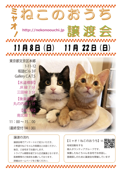 | イベント内容 | 参加する保護猫ちゃんについては、譲渡会一週間前からホームページにてご紹介しております。http://nekonoouchi.jp/ 事前予約はできません。譲渡会場でお会いしましょう。 【新型コロナウイルス対策について】 会場受付にて、以下の点をお願いする予定です。 ✿マスクの着用 ✿手洗いと消毒 ✿連絡先のご記入 御来場者多数の場合には入場制限を設けさせていただきます。 ※当日沢山のご来場者様がいらっしゃった場合、 整理券をお渡しする事がございます。 会場外で長時間お待たせする場合もございますが ご理解くださいますようお願い致します。 皆さまの長時間の在室を避ける為、 希望者様へは後日のご連絡とさせて頂きます。 ※ 感染防止対策時の特例となります。 ◇譲渡に関してのお願い 【ミャオ!ねこのおうち】では譲渡に際して、以下の要件をお願いしております。 ・完全室内飼いで終生愛育 ・脱走させないための対策 ・不妊去勢手術 ・譲渡誓約書の取り交わし ・医療費の一部ご負担 ・記念の写真撮影 ※60才以上の方のみのご家庭、独身や、経済的に困難な世帯、 必要な脱走対策を施していただけない方には原則的に譲渡はご遠慮頂いております。 また、保護主により譲渡条件が異なる場合もございますので会場でご相談ください。 参加予定ねこちゃんは、急な体調不良などで不参加になる場合もございます。 【譲渡に関してのお願い】・【医療費の一部のご負担】・【譲渡までの流れ】など 詳しくは下記ホームページをご覧くださいますよう宜しくお願い致します。 ミャオ!ねこのおうち譲渡会 ホームページ http://nekonoouchi.jp 公式facebookページ https://www.facebook.com/myaoneko.ginza/ 公式instagram https://www.instagram.com/myaoneko.ginza/ |