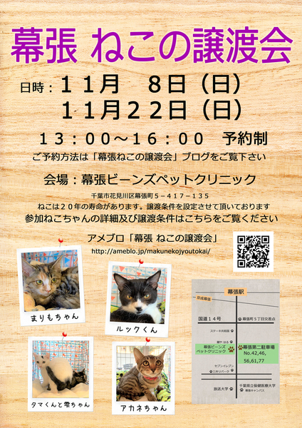 | 開催場所 | 千葉市花見川区幕張町5−417−135幕張ビーンズペットクリニック | ||