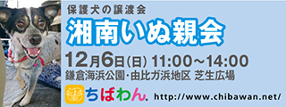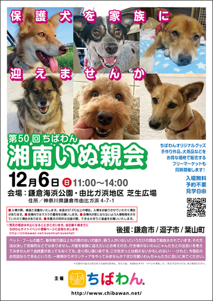 | イベント内容 | 1年ぶりの開催予定でしたが、場所的に観光で訪れる方が多いこともあり、新型コロナウィルス感染拡大防止を考慮し、今回の開催は見合わせることとなりました。 ご来場を予定されていた方には申し訳ございませんでした。 1年ぶりの開催となる湘南いぬ親会のご案内です。 下記をお読みいただき、可愛い保護犬たちに会いに来て下さい。 【ちばわんからのお願い】 ①会場内ではマスクの着用をお願いします。 ②入場の際、検温と消毒をいたします。体温が37.5℃以上の場合、入場をお断りさせていただく場合があります。 ③会場内が密にならないよう、入場制限をする場合があります。 ④卒業犬の同伴は当面の間、できるかぎりご遠慮をお願いいたします。 ※ポスターのいぬが参加犬とは限りません。また、どの子が参加するのか?のお問合せには返信できません。参加犬につきまして下記の「参加予定の子たち」をご覧ください。 https://chibawan.net/event/20201206-shonan-dog ※ネットによる募集も並行して行っています。「参加予定の子たち」に掲載されていても開催日前に、いぬ親さんが決定し不参加となる場合もあります。 ◆ 後援:鎌倉市・逗子市・葉山町 ◆詳細、中止のお知らせなどは、はちばわんHPイベント情報でお確かめください。 https://chibawan.net/eventcat/eventall https://chibawan.net/event/20201206-shonan-dog ◆アクセス 【電車&バス】 江の島電鉄「和田塚」または「由比ヶ浜」下車 徒歩約10分 【お車】「由比ヶ浜地下駐車場」の上が会場です。 ※お車は近隣のコインパーキングをご利用ください。 【 来場の際のお願い 】 ◆怖がりな犬や、子供さんを苦手とする犬もいます、触る前に、まずボランティアに声をおかけください。 ※お子さまと一緒にご来場いただく際は、特にご注意ください。 ◆会場に同伴される犬には、必ずリード(引き綱)をつけてください。 ※フレキシブルリード・ロングリードを伸ばした状態はご遠慮ください! 【いぬ親会の流れ】 ①黄色いバンダナをつけている犬が「いぬ親さん募集中」の保護犬たちです。 ② 気になる犬がいたら、まずは預かりボランティアとお話をしてみてください。 ③ 会場で、ご希望の犬が決まったら、アンケートフォームにご記入ください。 ※HPなどをご覧いただき、既に家族に迎えたい犬が決まっている場合は、ちばわんHPの【いぬ親】お申込みアンケートを事前送信していただければお話がスムーズに進みます。 →【いぬ親】お申込みアンケートhttps://chibawan.net/contactform_dog ④原則として3日以内にお返事の連絡をさせていただきます。 ※いぬ親会の会場で、直接犬を渡すことはできません。 ⑤ご縁が成立した場合には、後日こちらからご自宅までお届けし、約1ヶ月のお試し生活にはいります。お届けの際に、書面での譲渡契約書を交わします。 ≪譲渡決定の際は≫ いぬ親さんには、ワクチン・不妊手術代など保護犬にかかった費用として 「譲渡負担金」をお願いしています。 ちばわんHP「いぬ親さん募集」→menu「譲渡負担金について」をご覧ください。 https://chibawan.net/flowofadoptive/allocation 【その他】 ◆ご質問など、お気軽に会場ボランティアにお声掛けください。 ◆トイレは、いぬ親会場「芝生広場」となりの「タンコロ広場」にございます。 ◆お知らせ ♪♪ 湘南いぬ親会フリーマーケットコーナー ♪♪ 楽しいワンコグッズでいっぱいのフリマコーナー♪ 密にならないようスペースをとって、開催します。 ちばわんオリジナルY字リードなどの チャリティグッズもたくさんご用意しております。 ※ちばわんオリジナルチャリティグッズは、インターネットでも販売しております。 詳しくは「ちばわんチャリティグッズショップ」をご覧ください。 https://chibawan.ocnk.net/ ちばわんの活動費はフリマや募金活動で賄われています。 会場での募金および売上のすべては、ちばわん保護犬・保護猫たちの為の医療費等として大切に使わせていただいております。 皆さまの温かいご協力に感謝いたします。 【いぬ親会問い合わせ】 ※湘南いぬ親会に関するお問合せは、開催前日までにお願いいたします。 http://chibawan.net/inquiry_shounan |