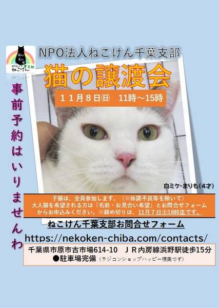 | イベント内容 | 春から夏に生まれた子猫を中心とした譲渡会です。 今回より通常スタイルの譲渡会と変更致しますが、コロナウイルス対策として ・会場内ではマスクのご着用と入退室の際は消毒をお願い致します。 ・混雑時には時間をずらしてのご入場とさせていただく場合がございます。 ご協力の程よろしくお願い致します。 成猫は指名制のお見合いとさせていただく子もおりますので、 『◯◯ちゃんと、お見合い希望』とご指名の事前申し込みをお願い致します。 ねこけん千葉支部のブログ内にありますお問い合わせフォームより、 ⚫︎お名前 ⚫︎ご住所(市区町村までで大丈夫です) ⚫︎お見合いご指名猫の名前を、お知らせください。 ※締め切りは譲渡会前日11月7日 18時までとなっております。 ねこけん千葉支部ブログ→ https://ameblo.jp/nekoken-chiba/ また、譲渡会会場では、千葉県内にお住いの預かりボランティアさん及びお世話ボランティアさんを募集しています。 ご希望の方は、大変お手数をおかけしますが、譲渡会までお越しください。 ※ご都合がつかない場合は、お問い合わせ先までご相談ください。 [日時] 11月8(日)11:00~15:00 [会場] 千葉県市原市古市場614-10 ※屋内での開催となり雨天決行です。 ※抱っこもOK! ※猫ちゃんの負担も考え、ご来場は時間内にお願い致します。 ※特にご予約などは必要ございませんのでご家族皆様でぜひお越し下さい。 ※駐車場あり。 [交通] 交通機関を利用してお越しの方 JR内房線 浜野駅より徒歩13分 浜野駅は、東京駅から京葉線→内房線でおよそ50分の距離!! お車でお越しの方 京葉道路蘇我インターより車で10分 ※駐車場はラジコンショップハッピー様裏手にございます駐車場をご利用ください [譲渡ご希望の方へのお願い] 誠に恐れ入りますが下記に当てはまります方への譲渡は不可となりますので予めご了承下さい。 ①学生さん、未成年の方、安定収入のない方 ②ペットを飼う事を許されていない住宅にお住まいの方 ③身体的、精神的疾病で治療中の方 ※60歳以上の方は別途条件がございますのでご相談下さい。 [譲渡の流れ] お申込み→審査→後日お届け→トライアル→正式譲渡 ※当日のお連れ帰りは出来ませんので予めご了承ください。 ※仮譲渡時にご希望の猫ちゃんにかかった医療費(血液検査・ワクチン・駆虫・不妊去勢手術等)をご負担願います。 しかし、正式譲渡に至らなかった場合は医療費を全額返済致します。 [主催] 動物愛護団体 NPO法人ねこけん 千葉支部 [ブログ] https://ameblo.jp/nekoken-chiba/ [参加動物] 成猫・子猫(ねこけん保護猫以外の猫ちゃんも参加予定です) [お問い合わせ] ご不明な点、ご質問等ございましたら下記までお問い合わせください。 chiba.info@nekoken.jp ※譲渡会へお越しの際、特に予約等必要ありません。 |