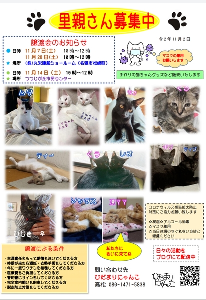 | イベント内容 | 保護猫の譲渡会です。 生後3か月から~2歳ぐらいまでの子が参加します 他にも猫のしゃれアイテム アクセサリーなどハンドメイドの作品もいっぱいです 詳細は「ひだまりにゃんこ」 https://ameblo.jp/teruteru0214/ をご覧ください |