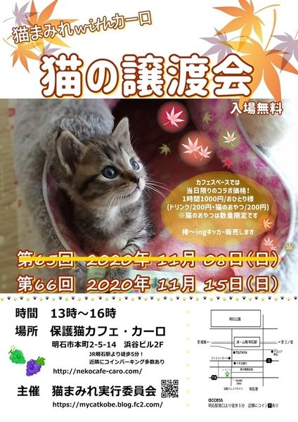 | イベント内容 | 猫の譲渡会 主催: 猫まみれwithカーロ 日時:11/15(日)13:00~16:00 場所: 兵庫県明石市本町2-5-14浜谷ビル2F 保護猫カフェ・カーロ 事務所(カーロさんへのお問い合わせはご遠慮ください) ※駅近くで徒歩で行けます お車は周りにコインパーキングがございます 参加猫はブログにてご確認ください https://mycatkobe.blog.fc2.com/ 順次参加猫のプロフィールを投稿しています 総勢20匹以上の子が会場で里親様とのご縁を待っています 是非、ご参加くださいm(__)m ※コロナ対策のため密にならないように人数制限、時間制限にて会場に案内させていただいています お待ちの時間に参加猫のプロフィールをご覧になってお待ちください 譲渡会にはマスク着用でお願い致します 室内は換気・次亜塩素水をたいて消毒を徹底しています 譲渡会は早いもの順ではございませんが早くに決まってしまう場合もありますのでご了承ください 参加猫ちゃんを見て気に入った子がいた場合はメールにてお問い合わせも可能です ●参加猫は保護主さんによって条件・譲渡費用は違いますので当日ご確認ください ●参加猫は初期医療・ワクチン接種済です ●当日猫は連れて帰れません。後日ご自宅までお届けとなります |