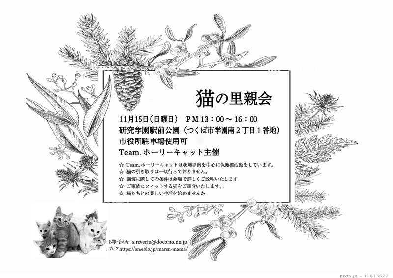 | イベント内容 | 三密にならないよう万全を尽くして開催致したいと思っております。 新型コロナウィルスやインフルエンザ予防と蔓延防止の為、マスク着用と手指の消毒のご協力をお願い致しますm(_ _)m チーム.ホーリーキャットは、茨城県を中心に保護猫活動をしています。 譲渡条件はございますが、猫を家族に迎えたい方に是非譲渡したいと考えております。 お留守番が長くてちゅうちょしている方には、お留守番がストレスではない性格の子や2匹飼いをオススメする等、お話をしていく中でフィットする猫をご紹介しております。 譲渡が決まりましたら、飼育環境確認のため、必ずご自宅にお届けさせて頂きます。 一部、ご家族になる子にかかった医療費をご負担いただいております。 ※当日参加予定の猫でも体調によりお休みさせていただく場合もあります。 ※参加猫は毎回変わりますので、最新情報は下記のブログからご確認ください。 https://ameblo.jp/maron-mama/ 入場は無料です。可愛い猫達がお待ちいたしております❣️ |