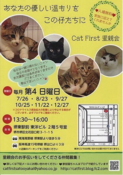 | イベント内容 | 〈皆さまへのお願い〉 ※コロナウィルス感染拡大防止の為、当日はマスク着用でお越し下さい。 ※また消毒のご協力お願い致します。 ※換気の為に会場の窓、入り口ドアを開放します。 その為猫の脱走防止対策として抱っこ、ケージのドアを開けての触れ合いは 原則禁止とします。 ※状況によりましては入場制限、時間制限を設ける場合がございます。 時間に余裕を持ってお越し下さい。 皆様にはご迷惑おかけ致しますが 何卒、ご理解ご協力のほど宜しくお願い致します。 ⚫︎入場料は無料です。 ⚫︎近隣にはコインパーキングもございます。 ⚫︎東洋ビルへのお問い合わせはご遠慮願います。 ⚫︎当日、猫は連れて帰れません。 ⚫︎里親会開催までに里親様が決まったり、 体調不良等の理由で当日参加できない場合がございます。 お問合せ先 catfirstsatooyakai@yahoo.co.jp ブログ http://catfirst.blog.fc2.com |