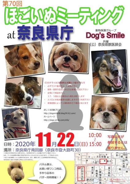 | イベント内容 | 11月22日(日曜日)、奈良県庁(奈良市)の南側回廊部分にて「第70回ほごいぬミーティングat奈良県庁」を開催します。 保護犬を家族に迎えようと考えている方、保護犬に会ってみたい方、保護犬について知りたい方、ぜひご来場ください。 相性を見るためなど先住わんこさん、卒業わんこさんのご参加ももちろんOKです。 当日は、Dog's smileグッズやワンコ用品の販売、Dog's smileを応援してくださる方々が手作りされた手作り雑貨などの販売も行います。どれもお買い得です。 また、売り上げは、私たちの活動資金になります。ぜひご協力をお願いします。 来場者のみなさまには、コロナウイルス感染拡大防止に御協力をお願いします。 ・必ずマスクを着用の上、御来場ください。 ・発熱・風邪の症状のある方の入場は御遠慮願います。 ・入口にて検温を行い、37.5℃以上の場合は、入場をお断りします。 ・入場時は、手指消毒への御協力をお願いします。 ・来場者の状況により、入場制限を行う場合があります。 なお、来場予定のワンコについては、活動ブログでご確認ください。 日時 令和2年11月22日(日)午前10時~午後3時 場所 奈良県庁 南側回廊部分 奈良市登大路町30 (近鉄奈良駅から東に徒歩6分、JR奈良駅から市内循環バス外回りに乗り県庁前バス停降りてすぐ) 協力 公益社団法人奈良県獣医師会、奈良県 |
