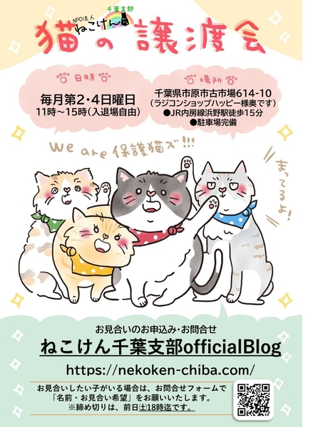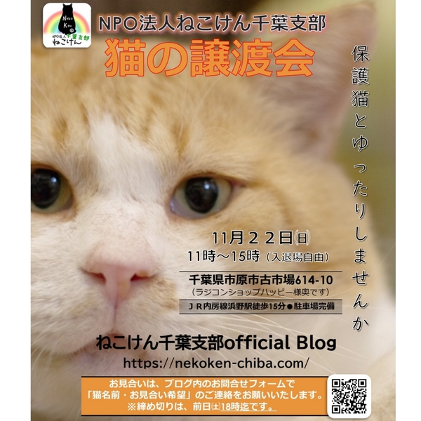 | イベント内容 | 春から夏に生まれた子猫を中心とした譲渡会です。 今回も通常スタイルの譲渡会と変更致しますが、コロナウイルス対策として ・会場内ではマスクのご着用と入退室の際は消毒をお願い致します。 ・混雑時には時間をずらしてのご入場とさせていただく場合がございます。 ご協力の程よろしくお願い致します。 成猫は指名制のお見合いとさせていただく子もおりますので、 『◯◯ちゃんと、お見合い希望』とご指名の事前申し込みをお願い致します。 ねこけん千葉支部のブログ内にありますお問い合わせフォームより、 ⚫︎お名前 ⚫︎ご住所(市区町村までで大丈夫です) ⚫︎お見合いご指名猫の名前を、お知らせください。 ※締め切りは譲渡会前日11月21日 18時までとなっております。 ねこけん千葉支部ブログ→ https://ameblo.jp/nekoken-chiba/ また、譲渡会会場では、千葉県内にお住いの預かりボランティアさん及びお世話ボランティアさんを募集しています。 ご希望の方は、大変お手数をおかけしますが、譲渡会までお越しください。 ※ご都合がつかない場合は、お問い合わせ先までご相談ください。 [日時] 11月22(日)11:00~15:00 [会場] 千葉県市原市古市場614-10 ※屋内での開催となり雨天決行です。 ※抱っこもOK! ※猫ちゃんの負担も考え、ご来場は時間内にお願い致します。 ※特にご予約などは必要ございませんのでご家族皆様でぜひお越し下さい。 ※駐車場あり。 [交通] 交通機関を利用してお越しの方 JR内房線 浜野駅より徒歩13分 浜野駅は、東京駅から京葉線→内房線でおよそ50分の距離!! お車でお越しの方 京葉道路蘇我インターより車で10分 ※駐車場はラジコンショップハッピー様裏手にございます駐車場をご利用ください [譲渡ご希望の方へのお願い] 誠に恐れ入りますが下記に当てはまります方への譲渡は不可となりますので予めご了承下さい。 ①学生さん、未成年の方、安定収入のない方 ②ペットを飼う事を許されていない住宅にお住まいの方 ③身体的、精神的疾病で治療中の方 ※60歳以上の方は別途条件がございますのでご相談下さい。 [譲渡の流れ] お申込み→審査→後日お届け→トライアル→正式譲渡 ※当日のお連れ帰りは出来ませんので予めご了承ください。 ※仮譲渡時にご希望の猫ちゃんにかかった医療費(血液検査・ワクチン・駆虫・不妊去勢手術等)をご負担願います。 しかし、正式譲渡に至らなかった場合は医療費を全額返済致します。 [主催] 動物愛護団体 NPO法人ねこけん 千葉支部 [ブログ] https://ameblo.jp/nekoken-chiba/ [参加動物] 成猫・子猫(ねこけん保護猫以外の猫ちゃんも参加予定です) [お問い合わせ] ご不明な点、ご質問等ございましたら下記までお問い合わせください。 chiba.info@nekoken.jp ※譲渡会へお越しの際、特に予約等必要ありません。 |