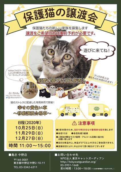 | イベント内容 | 幸せの黄色い車~移動譲渡会場車~が、島忠中野店さんにやってきます! 猫のメンタルに配慮した、特別仕様の車です。 猫たちに会いに来ていただけること 猫グッズ購入で支援してくださること 幸せ黄色い車を見に来ていただけること 全てがご支援になります。 当団体も島忠様と都度ご相談の上、消毒や検温の実施、ソーシャルディスタンスのご案内、衝立の設置などを行いながら開催を行います。 ご来場の際は、ソーシャルディスタンスや手洗いおよび咳エチケットの徹底、消毒などのご協力をお願い申しげます。 会場では、可愛い猫グッズも販売します! しょんぼり顔のふわふわ猫、ふーちゃんのオリジナルグッズも限定発売★ 「子猫の家族になりたい」「可愛い猫グッズが欲しい」「遊びに行くことで支援したい」 という方は是非いらしてください! ★猫の里親になるには事前申し込みが必要です★ 申し込みはコチラ http://www.tokyocatguardian.org/cats_171029.html 「幸せの黄色い車」の詳細についてはコチラ https://tokyocatguardian.org/yellow_car/ 【会場案内】 島忠 中野店 様 〒164-0001 中野区中野2-10-11 google map:https://goo.gl/maps/i8zBCg2bWFy (アクセス) ・電車 JR中央線中野駅南口より徒歩7分 ・車 大型駐車場完備 料金: 2,000円未満 1時間無料 2,000円以上 2時間無料 ※以後30分ごとに300円 |