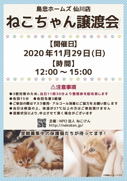 | イベント内容 | 長らく自粛していたねこけん譲渡会、島忠ホームズ様にて再始動です! https://cms.mechao.tv/shimachu/stores-newsdetail?e=a891083a29d87db07b2208359ccb77d7&s=36a3af90e5d5fa6171024efa53839afd ★NPO法人ねこけん里親会★ 20〜30頭前後の子猫さんや成猫さんが参加予定(*^^)v ネット掲載されていない猫ちゃんも参加します。 家族としてお迎えいただく猫ちゃんです。 実際に会って、よ~く考えてから決めて下さい! [開催日] 2020/11/29(日) [会場] 島忠ホームズ仙川店 3階 〒182-0003 東京都調布市若葉町2-1-7 https://www.shimachu.co.jp/gmshop/tokyo/313.html ※当日11:30より整理券を3階フロアにて配布します。 (各回15分、各回先着3組様) ※屋内での開催となり雨天決行です。 ※猫ちゃんたちとのふれあいはできません。 [交通] ・京王線「仙川駅」より徒歩約5分 ・駐車場完備 [主催] 動物愛護団体 NPO法人ねこけん [ホームページ] http://nekoken.JP [ブログ] http://ameblo.jp/naoofjapan/ [Instagram] https://www.instagram.com/nekoken2222/ [里親ご希望の方へのお願い] 誠に恐れ入りますが下記に当てはまります方への譲渡は不可となりますので予めご了承下さい。 ①学生さん、未成年の方、安定収入のない方 ②ペットを飼う事を許されていない住宅にお住まいの方 ③身体的、精神的疾病で治療中の方 ※60歳以上の方は別途条件がございますのでご相談下さい。 [譲渡の流れ] お申込み→審査→後日お届け→トライアル→正式譲渡 ※当日のお連れ帰りは出来ませんので予めご了承ください。 ※仮譲渡時にご希望の猫ちゃんにかかった医療費(血液検査・ワクチン・駆虫・不妊去勢手術等)をご負担願います。しかし、正式譲渡に至らなかった場合は医療費を全額返済致します。 ご不明な点、ご質問等ございましたら下記までお問い合わせください。 [連絡先] NPO法人ねこけん東京本部 https://nekoken.jp/inquiry/ nekoken@cat.email.ne.jp |