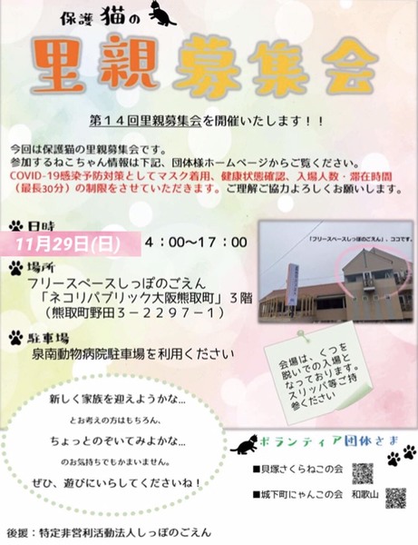 | イベント内容 | 11月29日(日)に大阪府泉南郡熊取町 ネコリパブリック様にて「保護猫の里親募集会」を開催いたします。 【日時】2020年11月29日(日)14:00~17:00 【会場】ネコリパブリック大阪府熊取店3F (*猫カフェスペースとは入り口が異なりますのでご注意ください) ※入場無料です。 ※車でお越しの方は、泉南動物病院駐車場をご利用ください ※COVID-19感染予防策としてマスク着用、健康状態確認、入場人数・滞在時間の制限をさせていただきますことご了承ください |