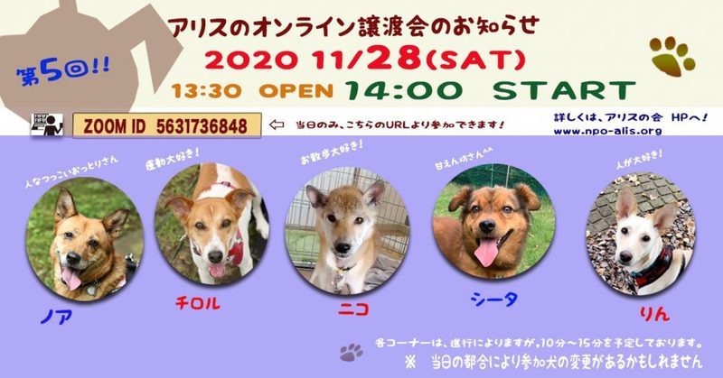 | イベント内容 | 11月28日:土曜日 14:00より 第5回アリスのオンライン譲渡会を 開催いたします 13:30よりオープンいたします 参加犬は ニコ、ノア、チロル、シータ、リンの5頭です どの子もすっかり可愛くなりました みなさまのご参加をお待ちいたしております zoomでご不明な点がございましたらalis1993@live.jpまでお問合せください こちらのURLをクリックしてご参加ください 当日、zoomにお入りいただけます https://us02web.zoom.us/j/5631736848 ID 5631736848 |